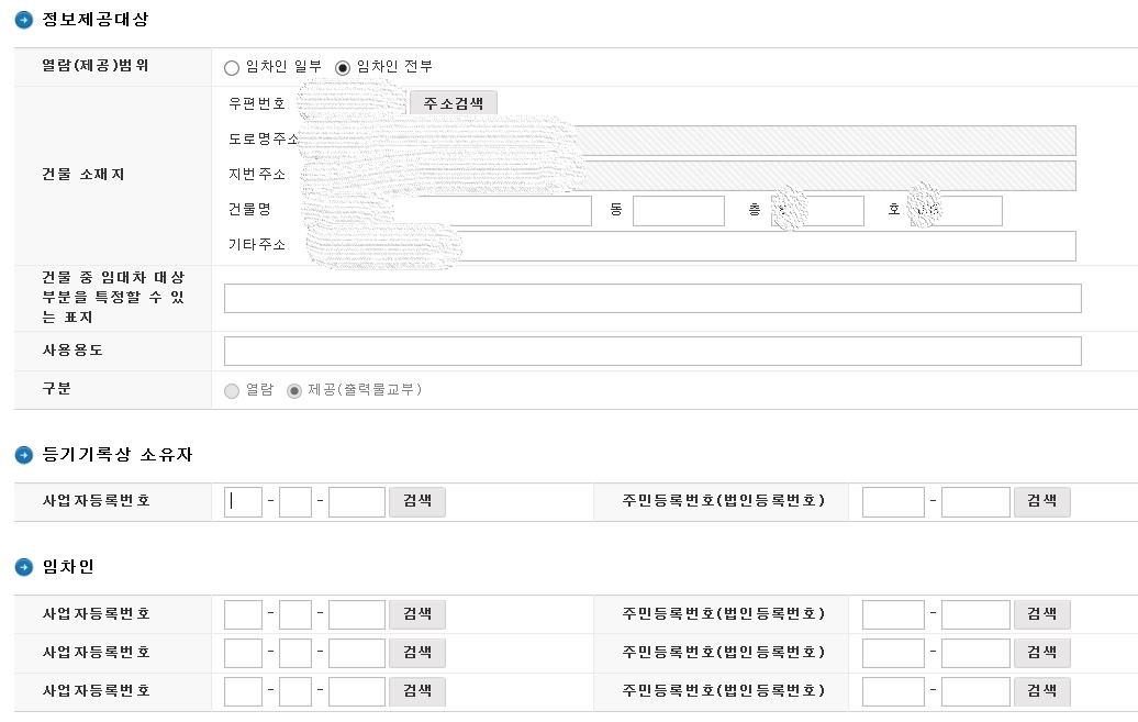 ‘정보제공대상’ , ‘등기기록상 소유자’, ‘임차인 정보’등... 해당 하는 부분의 내용을 입력해줍니다.
