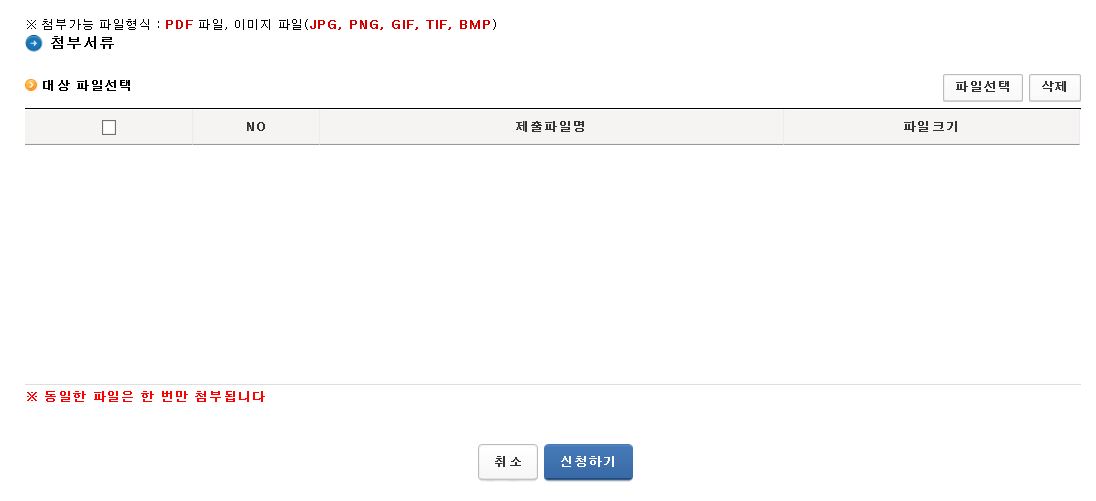 이해관계인 해당사유를 통해 확인한 첨부서류를 업로드 후 ‘신청하기’ 버튼을 눌러줍니다