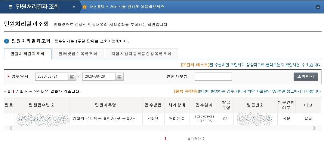 처리가 되면 '인터넷접수목록조회'로 넘어가서 신청이 정상적으로 완료됬음을 확인할 수 있습니다
